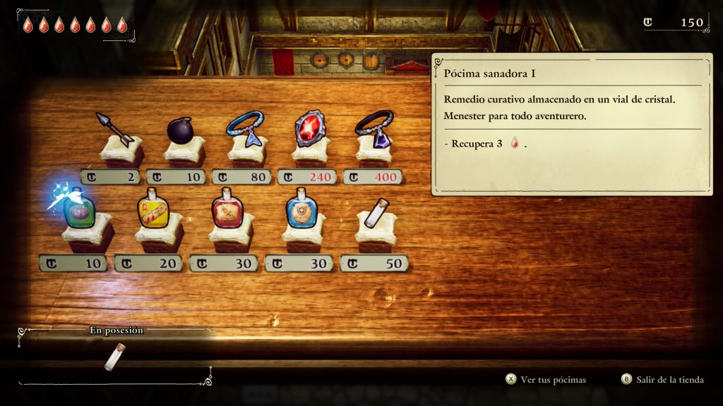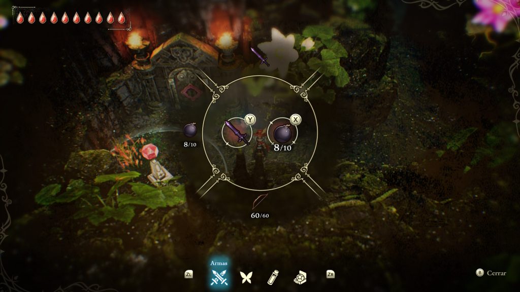 Si abres el menú, encontrarás tu inventario, que recuerda a los juegos de la saga Zelda, donde tienes de base una espada, un arco, bombas, un escudo y un vial que puedes rellenar con curas.
