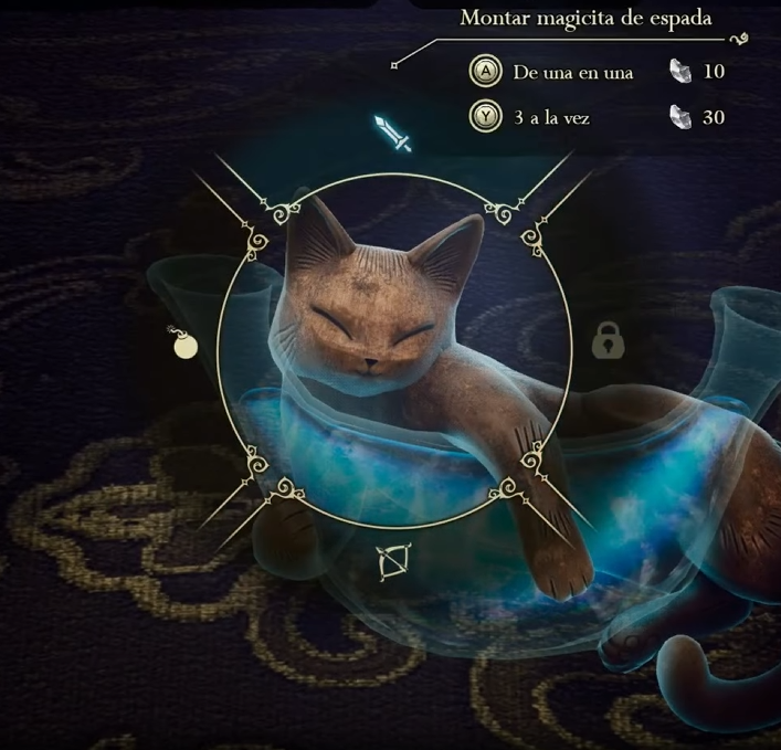 Montar magicitas. Procesamos fragmentos para crear esas joyitas de las que hemos hablado. Podemos elegir para qué arma queremos los nuevos atributos que nos aportan esas joyas: espada, bombas o arco. De momento, solo nos dan esas opciones.