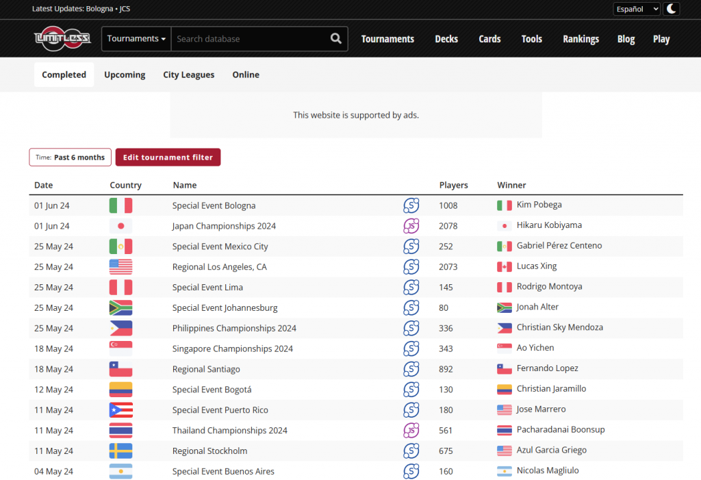Aquí tienes una lista de todos los torneos que se han ido celebrando y la fecha. Te aconsejo que te fijes en los más recientes, que son los que tienen los mazos más actualizados a fin de cuentas.