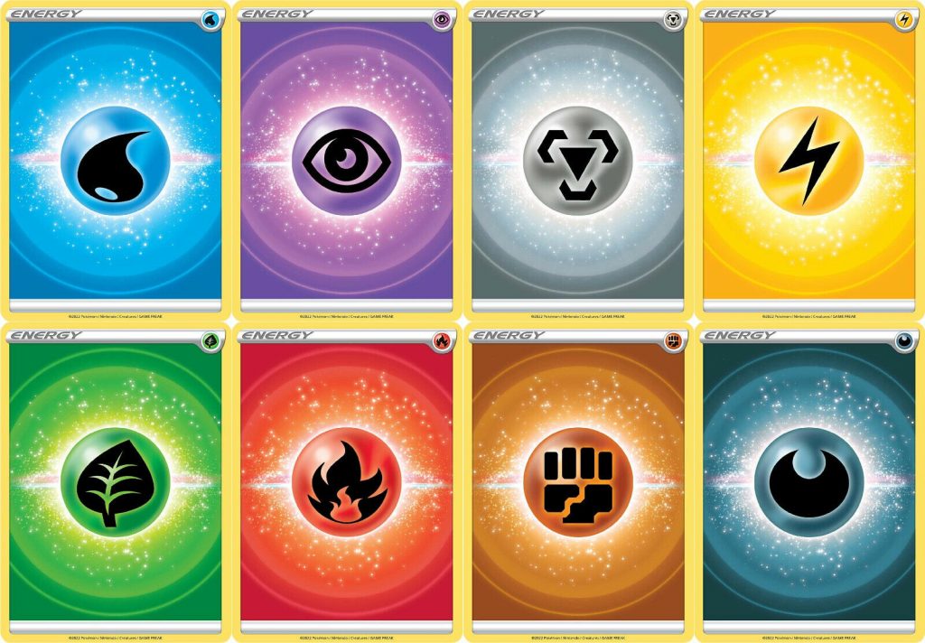 Para que los Pokémon ataquen, necesitaremos cargarlos con cartas de energía. Existen varios tipos: psíquico, agua, planta, fuego, eléctrico, siniestro, dragón, lucha, acero y normal.
