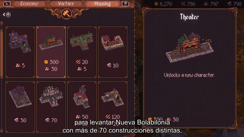Me ha encantado la estética pixel que utiliza, con ambientación oscura, algo tétrica y con personajes muy bien diseñados y atractivos. Uno de tus cometidos es también construir una nueva ciudad. Los edificios a elegir son guapísimos y cada uno parece otorgar unas características a la ciudad o a la jugabilidad.